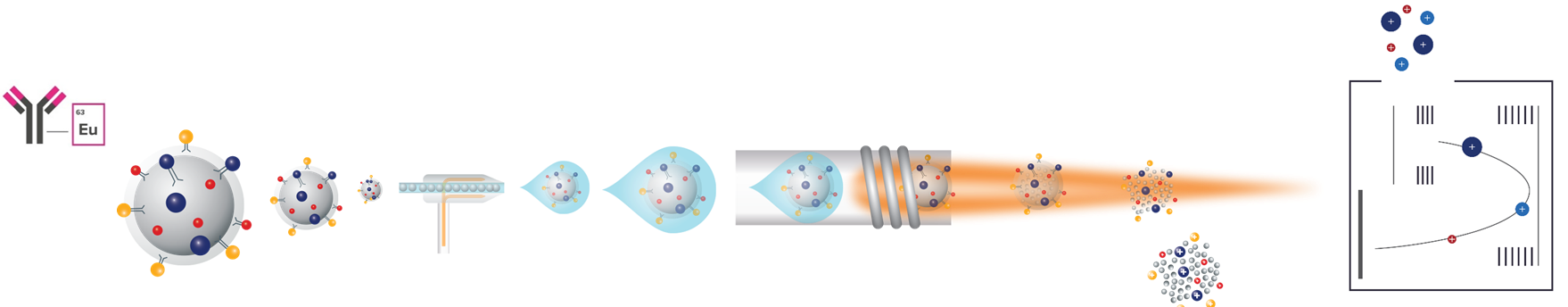 蛋白質體核心團隊 近年來,高維度免疫分析在醫學研究中的重要性日益提升。隨著研究問題愈加複雜,傳統以螢光訊號為基礎的多重免疫技術逐漸暴露出其物理上的侷限,包括光譜重疊、自體螢光干擾與補償矩陣等問題,使多重染色難以突破既有的標記上限,也增加弱表現蛋白的偵測難度。當研究者希望在同一實驗中同時觀察多個細胞族群、免疫調控蛋白或腫瘤微環境的複雜互動時,螢光平台的限制更顯突出。 在此背景下,金屬同位素為媒介的 CyTOF(Cytometry by Time-of-Flight) 提供了具突破性的解方。CyTOF 以 ICP-TOF 質譜技術分離金屬訊號,每一個標記皆以離散的質量峰呈現,完全跳脫光譜連續性所帶來的干擾 (圖一)。
