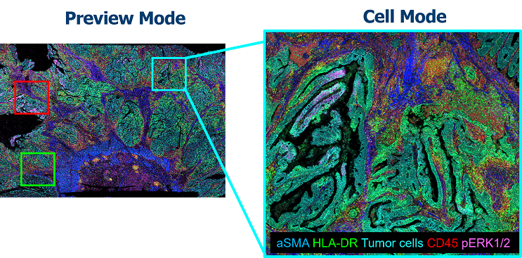 圖三、IMC 掃描模式示意。研究者可先於低倍預覽影像中選取 ROI,再以 1 µm 解析度進行高精度多重蛋白分析。 對臨床醫師而言,IMC 的重要性在於它能直接在單張切片上呈現多種細胞族群之間的距離、接觸關係與微環境分布,而不再需要依賴多次染色、多張切片或主觀推測來判斷細胞間的互動 (圖四)。