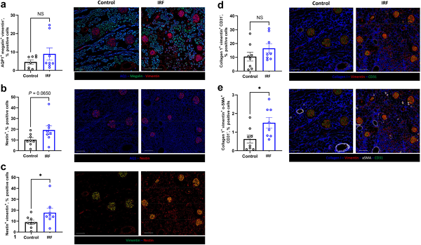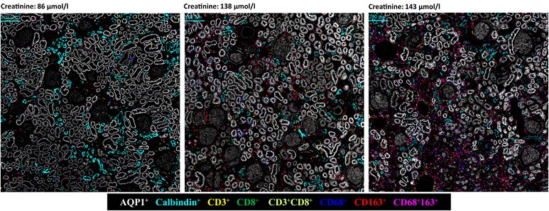 圖四、IMC 多重免疫影像。可同時觀察多種蛋白的表達程度及其在組織中的空間位置,協助解析腫瘤與免疫細胞的微環境結構。 腎臟疾病研究便是一個 IMC 發揮高度價值的典型例子。腎臟組織由多種細胞類型組成,包括曲小管細胞、集合管細胞、基質細胞、內皮細胞及多樣化的免疫細胞,其空間架構高度複雜且具區域性。傳統病理染色雖能呈現結構變化,但對免疫細胞的分類能力有限,也難以一次觀察大量蛋白的表現差異。近年的研究利用 IMC 在腎臟組織中進行多重免疫分析,清楚描繪不同腎臟結構區域的免疫細胞浸潤情形,並能同時觀察腎臟受損區域的細胞表型變化。例如,在分析腎功能減退與發炎相關的腎臟組織時,可利用 IMC 同時讀取近曲小管細胞、遠曲小管細胞、腎臟纖維母細胞與多種免疫細胞的空間分布。研究顯示,CD8 T 細胞與 CD68、CD163 陽性巨噬細胞的增多,常與腎臟受損區域的位置緊密相關,而這些空間共現訊號能為腎臟病變的機制提供關鍵證據。 IMC 在此類研究中的角色,不僅是鑑定細胞種類,更重要的是重新描繪細胞間的「空間互動關係」,協助醫師與研究者理解免疫細胞如何參與腎臟損傷的發生與惡化。在腎功能受損(impaired renal function, IRF)後,多項與發炎反應、免疫調控與細胞訊號傳遞相關的生物學路徑顯著上調。進一步分析人類腎臟組織切片,可觀察到隨血清 creatinine 上升,CD68⁺/CD163⁺ 巨噬細胞與 CD3⁺/CD8⁺ 細胞毒性 T 細胞在腎臟組織中的分布與密度明顯改變。腎小管結構則以 Aquaporin-1 與 Calbindin 作為近曲與遠曲小管的標記,以利解析免疫細胞與腎臟結構之間的空間關係 (圖五;上)。 進一步的 IMC 定量分析顯示,多種與腎絲球與近曲小管損傷及纖維化相關的細胞族群(如 vimentin⁺、nestin⁺、collagen⁺ 與 α-SMA⁺ 細胞)在 IRF 狀態下比例增加,顯示免疫細胞浸潤與腎臟結構重塑之間的密切關聯 (圖五;下)。此結果突顯 IMC 在同一張組織切片中,同步整合免疫細胞組成、腎臟結構變化與空間分布資訊的分析優勢。